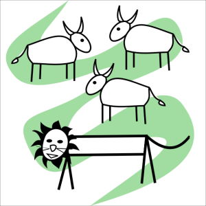 Three bulls were such great friends that they always grazed together in the same field. A lion had watched them for many days with longing in his eyes in the hope of seizing them for his prize, but he found that there was little chance so long as they all kept together. Therefore, he secretly began to spread evil and slanderous rumours pitting one against the other until he had fomented jealousy and distrust among them. No sooner did the lion see that they avoided one another and grazed separately than he attacked them one by one and made an easy prey of them all.
